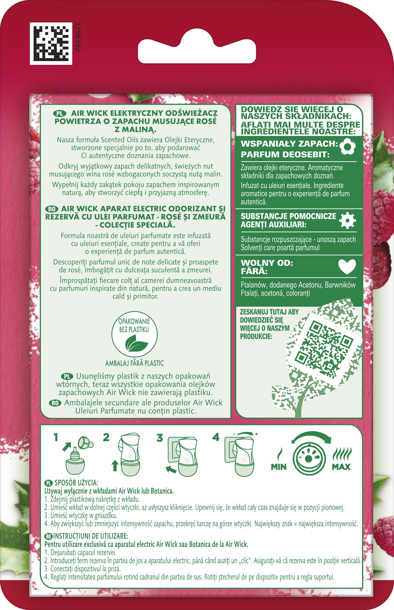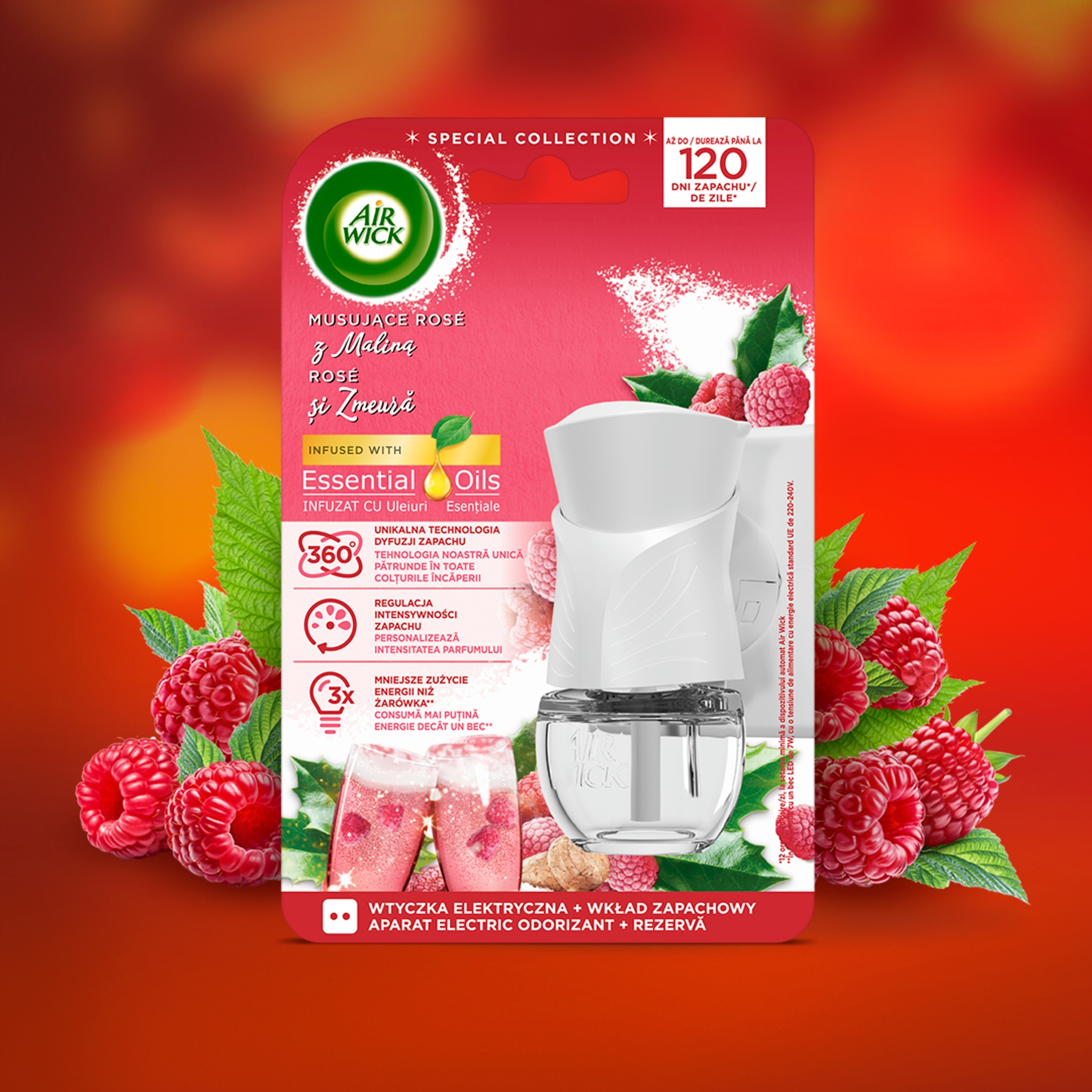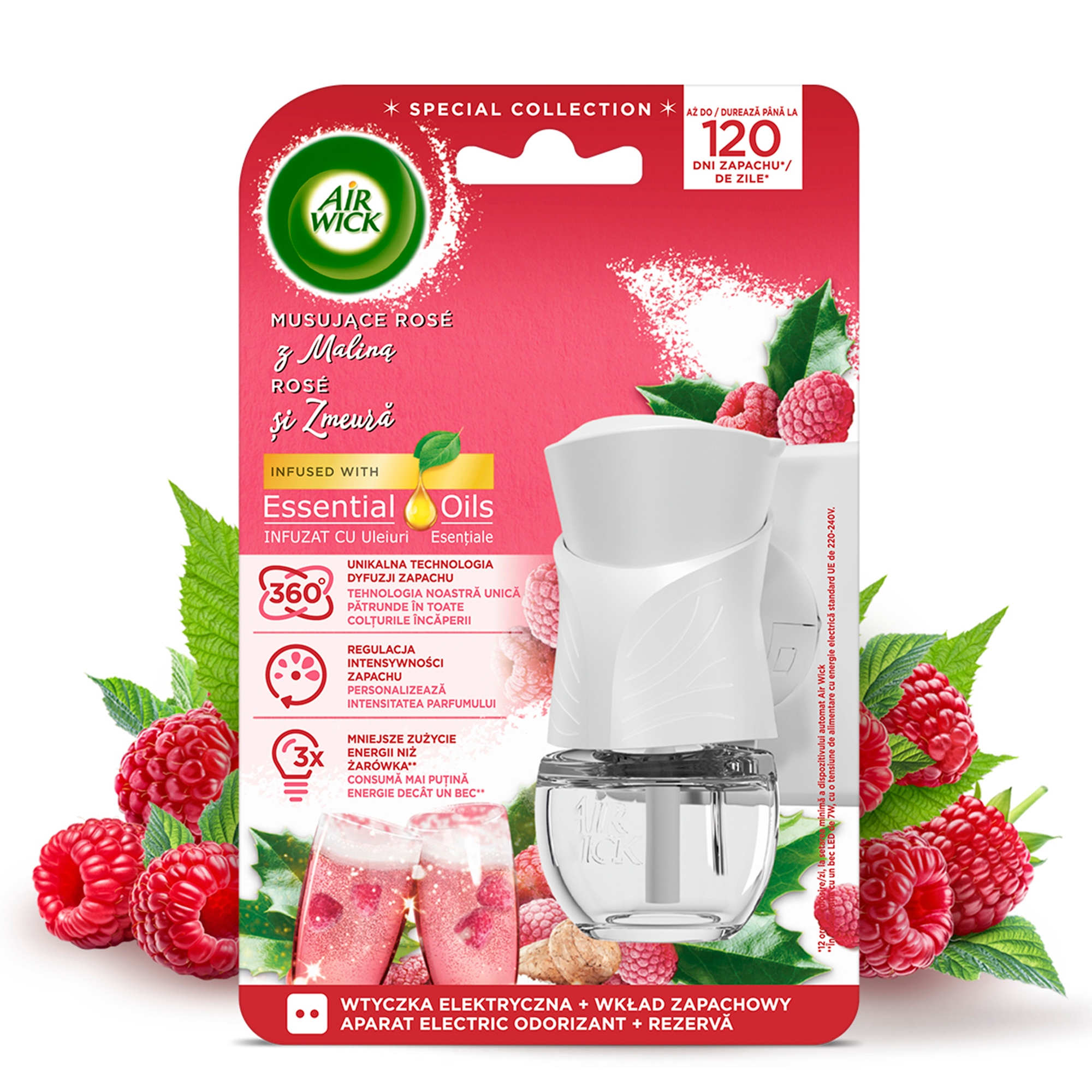 Zapach Air Wick Elektryczny Odświeżacz Musujące Wino z Maliną należy do kolekcji Essential Oils której kompozycje zapachowe zostały zainspirowane naturalnymi esencjami pochodzącymi z owoców, kwiatów i roślin, aby stworzyć wyjątkowy nastrój w Twoim domu.