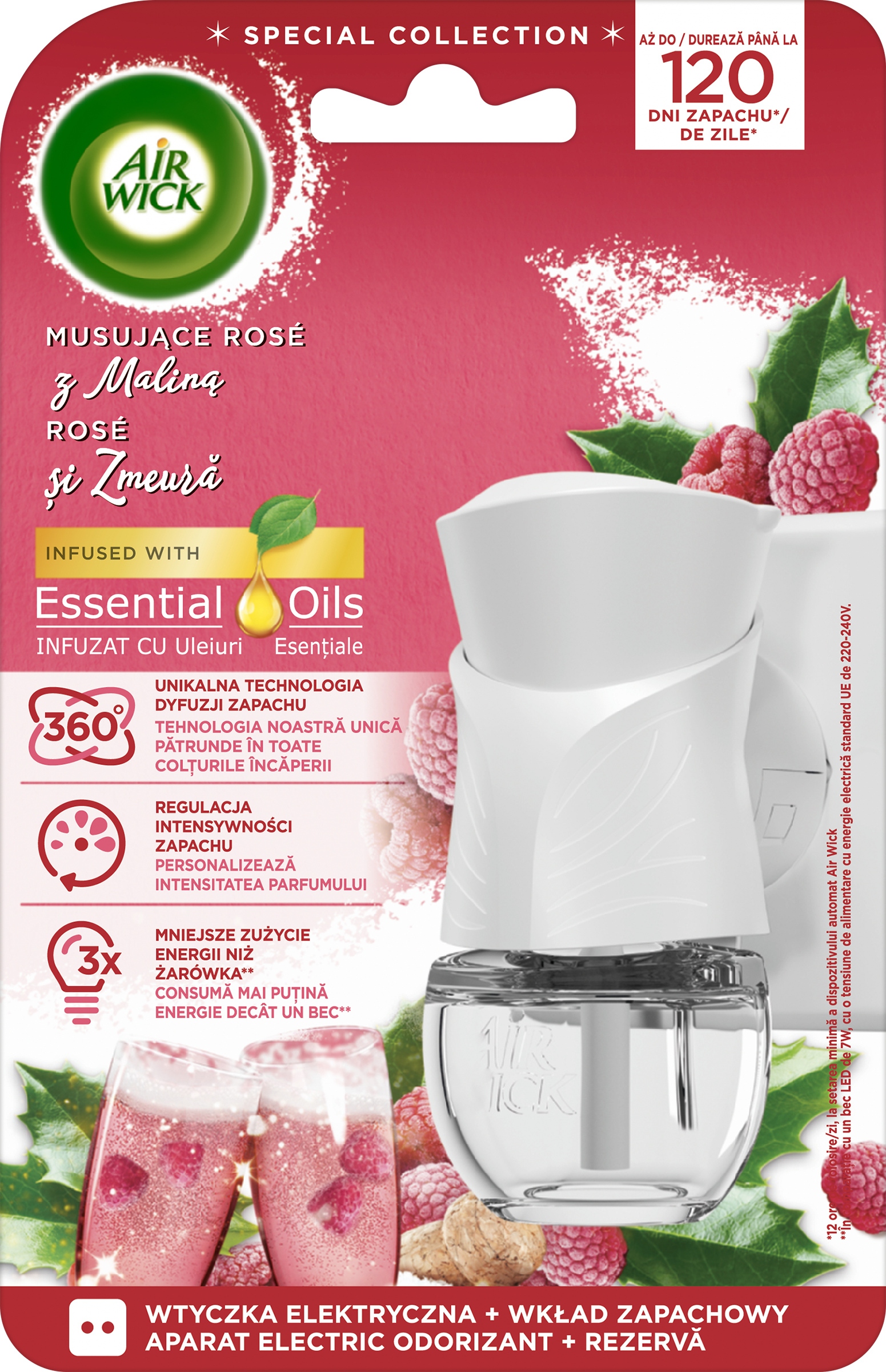 Nasza formuła została stworzona z naturalnych olejków eterycznych, aby zapewnić prawdziwie autentyczne doznania zapachowe w Twoim domu. Zanurz się w zapachu słodkiego owocowego różowego szampana, wzbogaconego słodką maliną – dla prawdziwej zimowej przytulności! Wypełnij cały swój dom naszymi zapachami inspirowanymi naturą, aby stworzyć zachęcające i przytulne środowisko domowe! Elektryczne urządzenie Air Wick będzie pachnieć w Twoim domu do 120 dni i stworzy przyjemny zapach różanego szampana i malin. Nowa formuła z naturalnymi składnikami* i naturalnymi olejkami eterycznymi tworzy prawdziwie autentyczny zapach w Twoim domu.