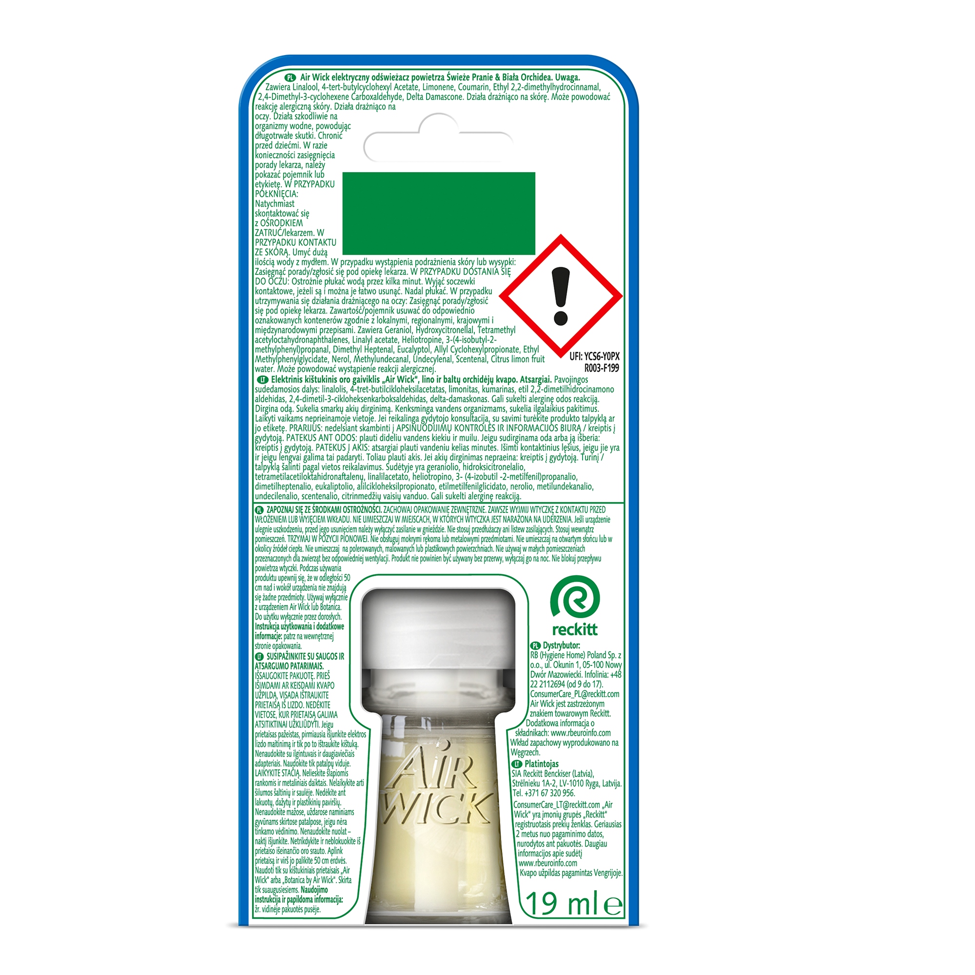 Przed użyciem zapoznaj się ze środkami ostrożności i instrukcją, którą zachowaj. Urządzenie działa na baterie. Wyłącznie dla dorosłych. Nieprzeznaczone do użytku przez dzieci ani osoby o obniżonej sprawności ruchowej, sensorycznej lub umysłowej. WYŁĄCZ URZĄDZENIE PRZED WŁOŻENIEM WKŁADU.Wkłady są wyposażone w nasadkę zabezpieczającą przed dziećmi. Po otwarciu nie przechowuj wkładu poza urządzeniem. Nie zostawiaj go bez nadzoru. Po opróżnieniu wkładu usuń go bezpiecznie z dala od dzieci. Używać w dobrze wentylowanych pomieszczeniach tylko zgodnie z zaleceniami. CHRONIĆ PRZED DZIEĆMI I ZWIERZĘTAMI DOMOWYMI. NIE POŁYKAĆ. Używać wyłącznie z wkładami Air Wick Essential Mist. Używaj tylko baterii alkalicznych. Upewnij się, że bateria jest prawidłowo umieszczona w urządzeniu, zgodnie z oznaczeniami (+) i (-). Jeśli nastąpi jakikolwiek wyciek z baterii, usuń ją i wyczyść dokładnie urządzenie. Jeśli nie zamierzasz używać urządzenia przez dłuższy czas, wyjmij baterię. Jeżeli planujesz ponadtygodniowy pobyt poza domem, wyłącz urządzenie. Chronić urządzenie przed źródłami ciepła, ogniem, urządzeniami elektrycznymi, słońcem i przed nagrzaniem powyżej temperatury 50°C. Nie używaj jednocześnie baterii używanych i nowych, różnych producentów czy różnych typów. Baterie nie powinny być narażone na działanie wody, ognia czy wysokich temperatur. Nie powoduj spięcia. Nie ładuj baterii. Utylizacja: należy wziąć pod uwagę obowiązujące normy prawne. Wyjąć baterie. Zutylizuj zużyty pojemnik po wkładzie. Urządzenie wyrzuć do odpowiednio oznaczonego kosza. Osoby cierpiące na nadwrażliwość zapachową powinny zachować ostrożność przy stosowaniu tego produktu. Odświeżacze powietrza nie mogą zwolnić z przestrzegania zasad postępowania w zakresie higieny.