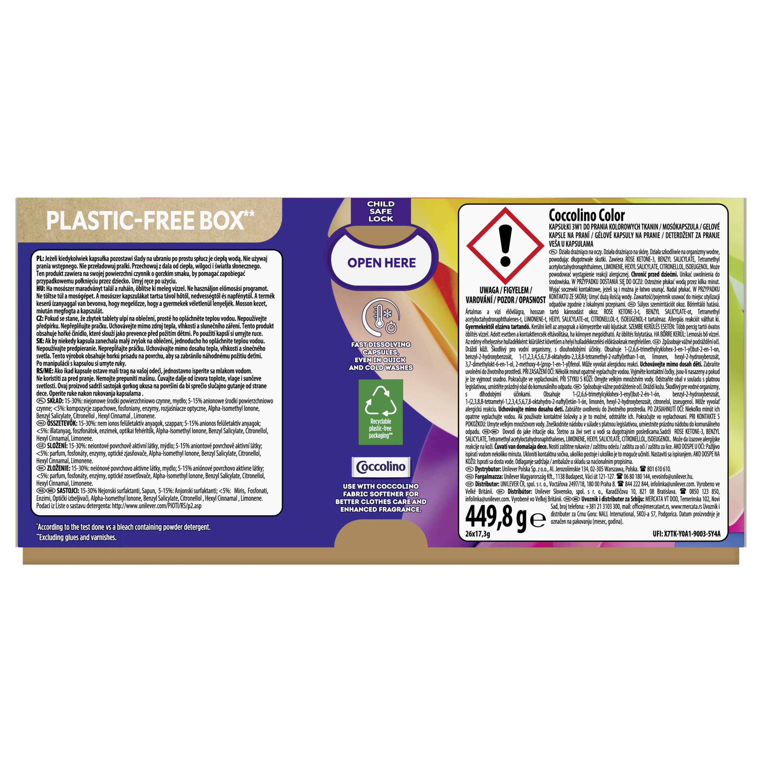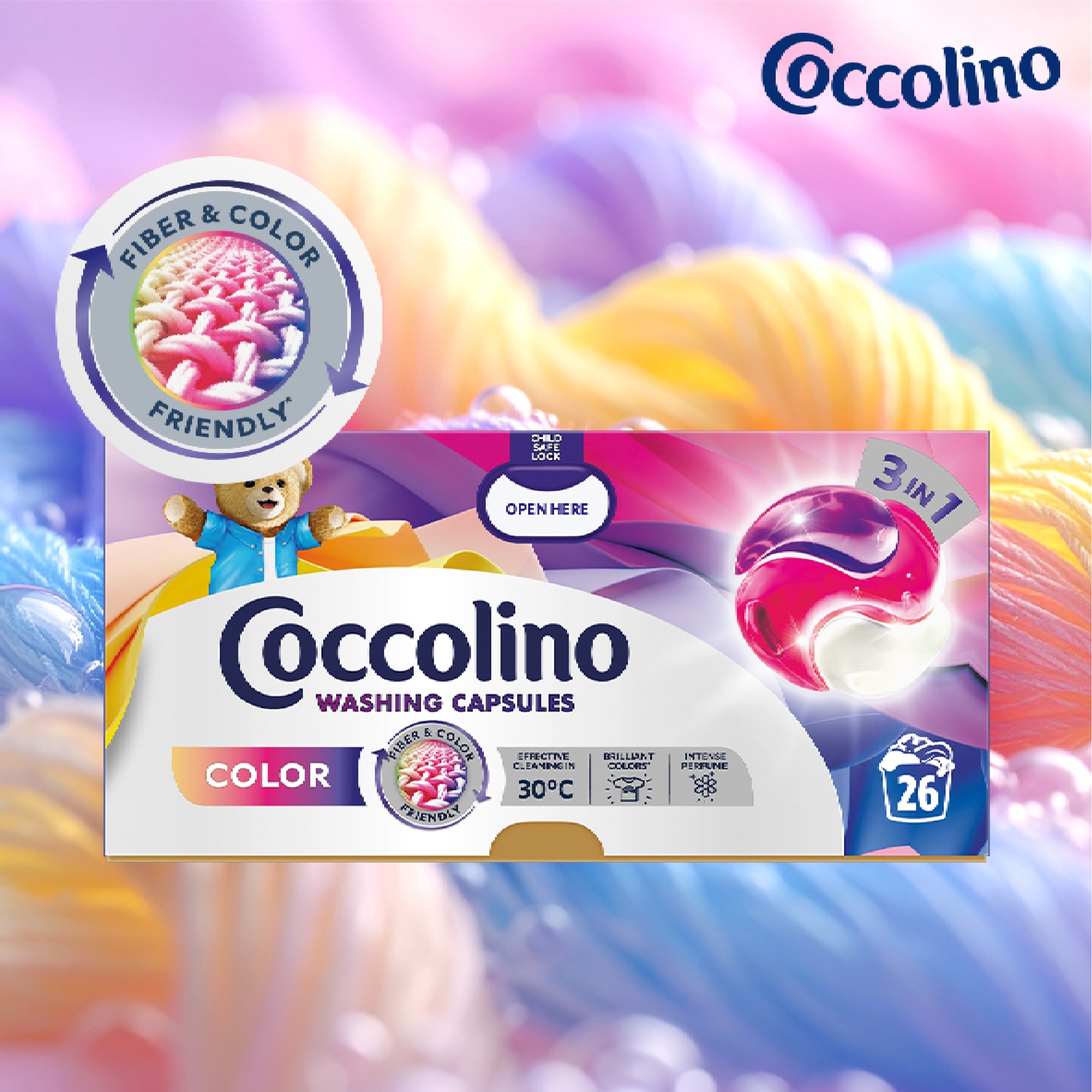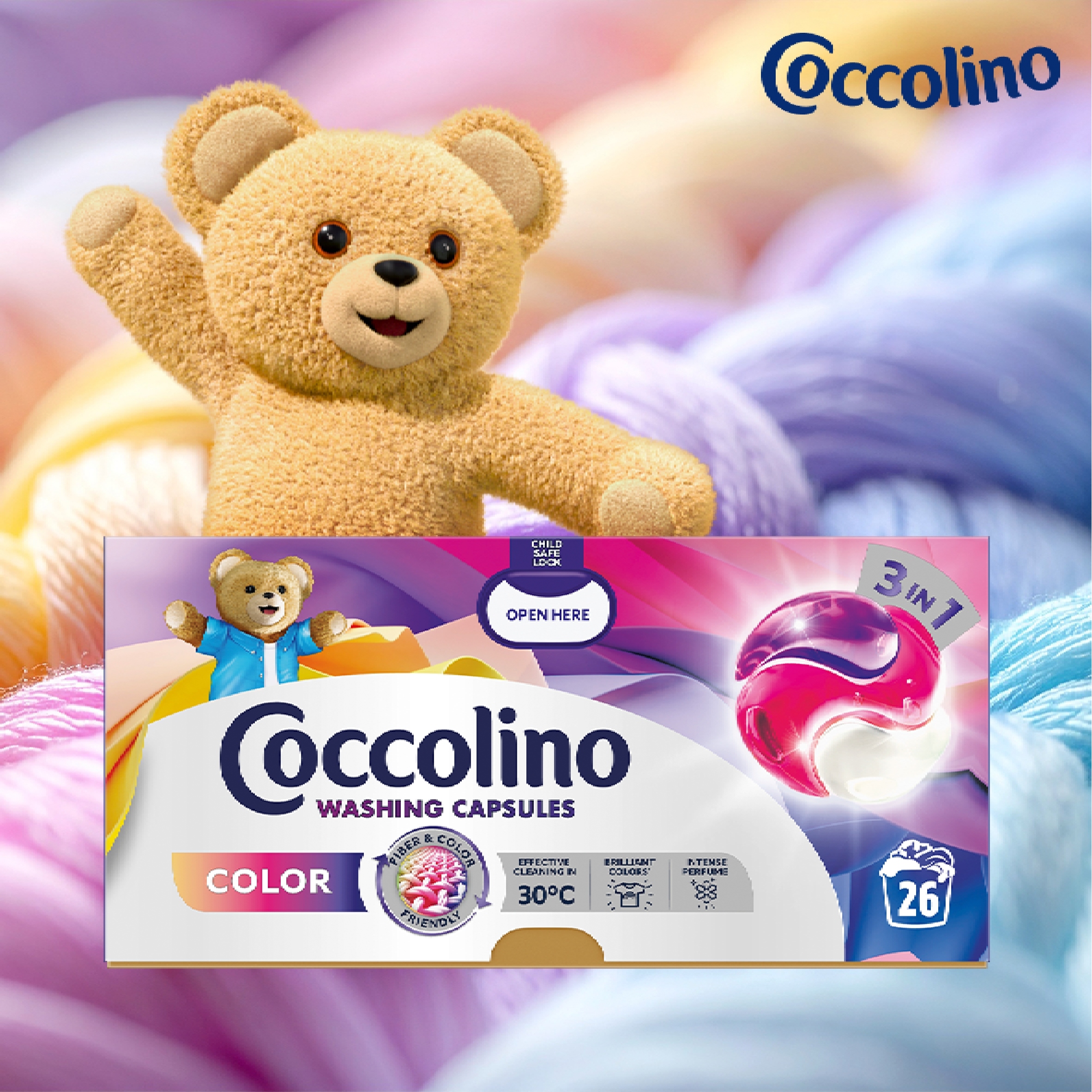 Wyjątkowa kapsułka do prania Coccolino 3w1 Color czyści, zapewnia kompleksową ochronę ubrań i sprawia, że możesz cieszyć się nimi każdego dnia. Pomaga zachować kolor i kształt ubrań, zapewniając jednocześnie skuteczne czyszczenie w temperaturach nawet do 30 stopni!
